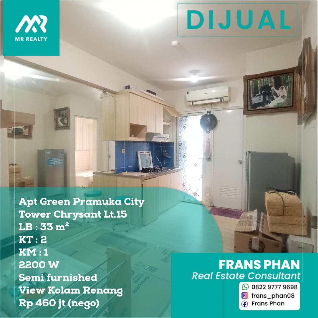Dijual Apartemen Green Pramuka City  Tower Chrysant Lt.15 Tipe 2 BR