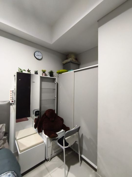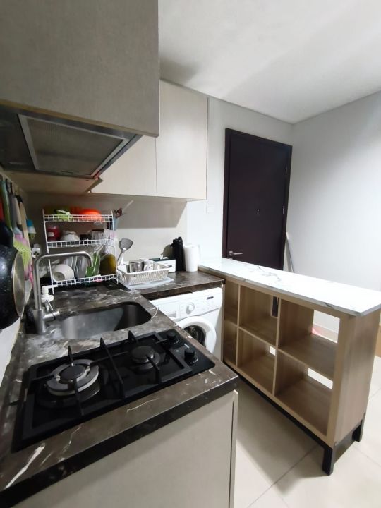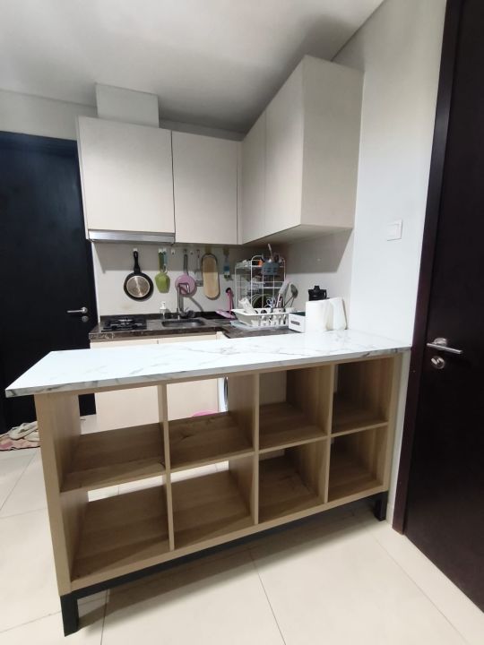 - panci kukus, goreng, rebus, spatula goreng, gunting dapur, pisau dapur, talenan, kettle air listrik, kompor gas + tabung gas, rice cooker, cooker hood