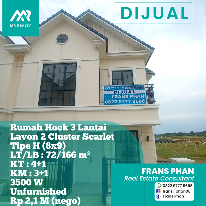 Dijual Rumah Hoek 3 Lantai Lavon 2 Cluster Scarlet, Tipe H (8x9)