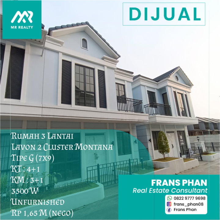 Dijual Rumah 3 Lantai Lavon 2 Cluster Montana Tipe G (7x9)