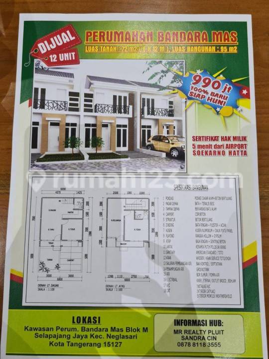 DIJUAL PERUMAHAN BANDARA MAS BLOK M, Tanggerang Kota. Ada 12 Unit Rumah, Tipe : 72x95 m2 Listrik : 2,200 Watt dengan harga 990Juta,- / Per unit. Pembayaran Rumah Bisa Cash ataupun Angusuran 12x Tampa Bunga. Harga jual Tidak termasuk : BPHTB ( Biaya Perolehan Hak Atas Tanah Bangunan ) PPN, AJB Balik Nama Sertifikat Catatan : Harga dapat berubah sewaktu - waktu Keterlambatan pembayaran dikenakan denda 0.1% per hari Harga jual sudah termasuk : IMB, pecah Sertifikat Minat Dapat Hubungi Sandra Cin +628129383xxxx WA ) MR Realty