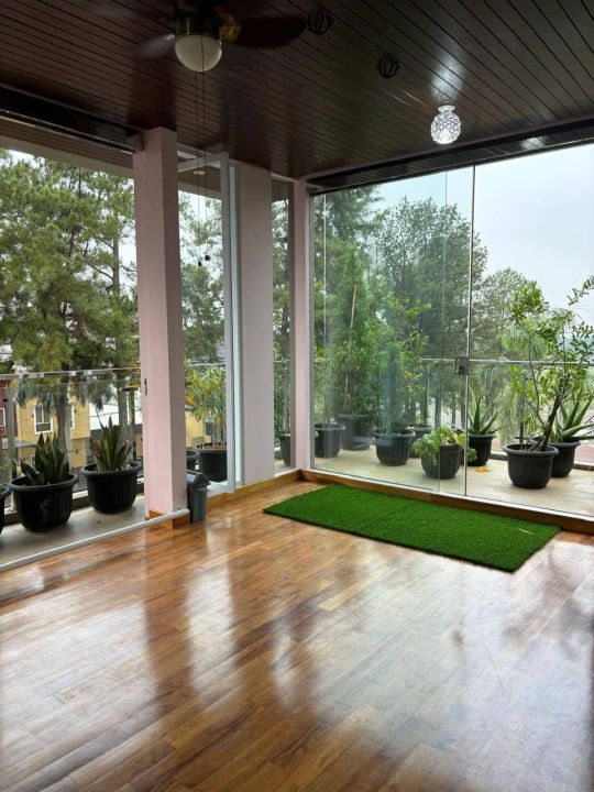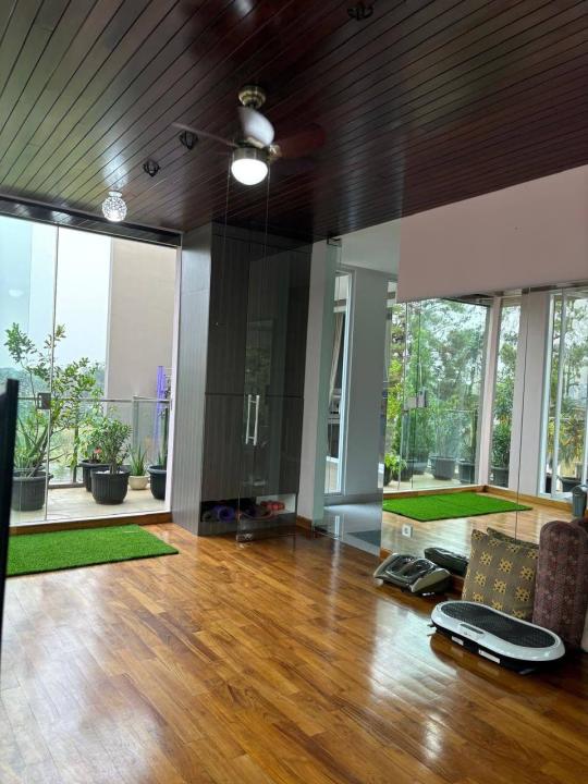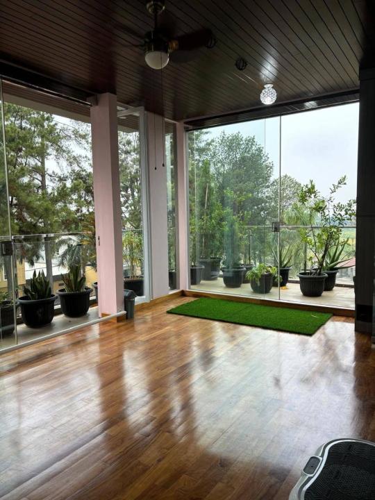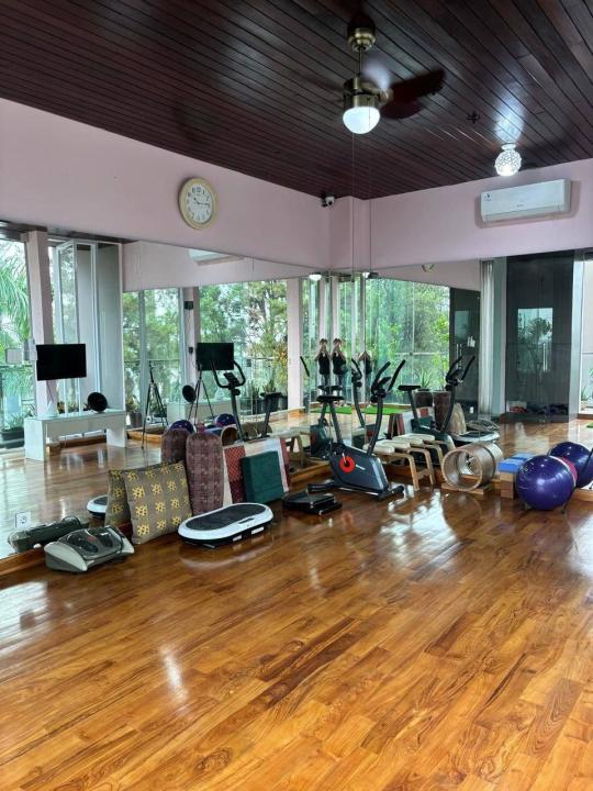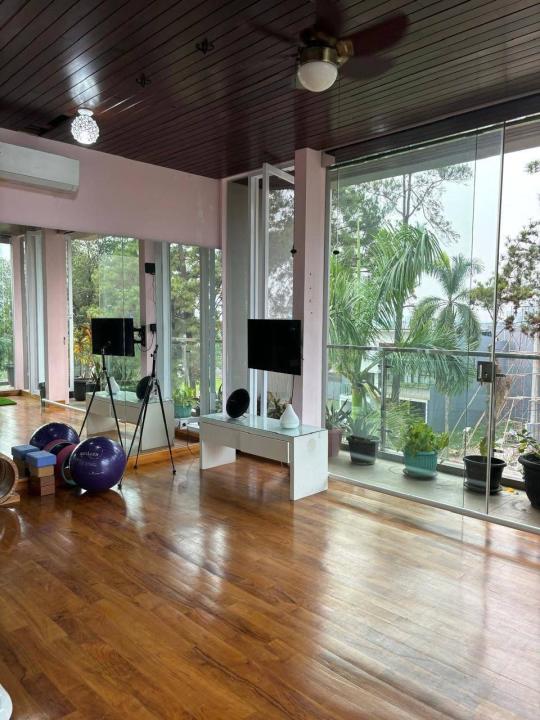 Ruang yoga dengan lantai kayu jati solid