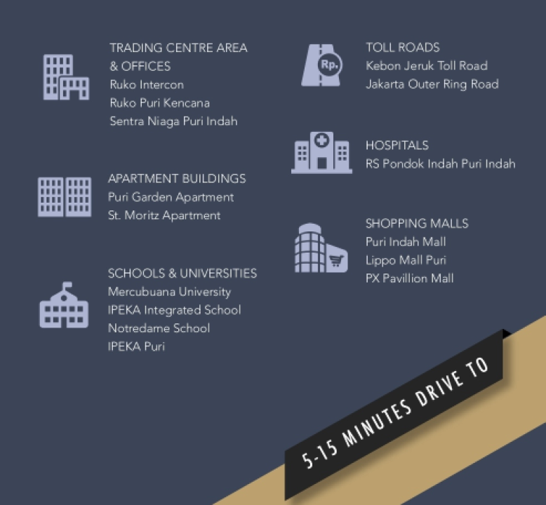 * 10 menit ke Lippo Mall Puri, Mall Puri Indah, Lotte Mart, RS Siloam Kebun Jeruk, RS Jakarta Eye Center, RS Graha Kedoya.